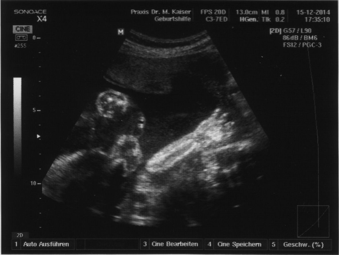 Auf dem Ultraschall-Bild ist unten rechts der Kopf zu erkennen. Viel besser ist aber die winkende Hand zu erkennen.
