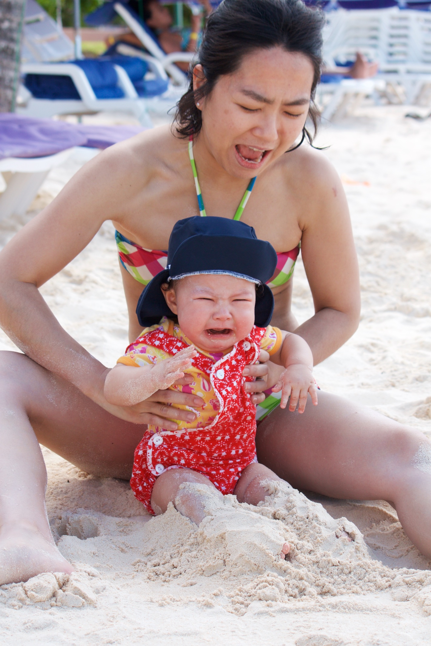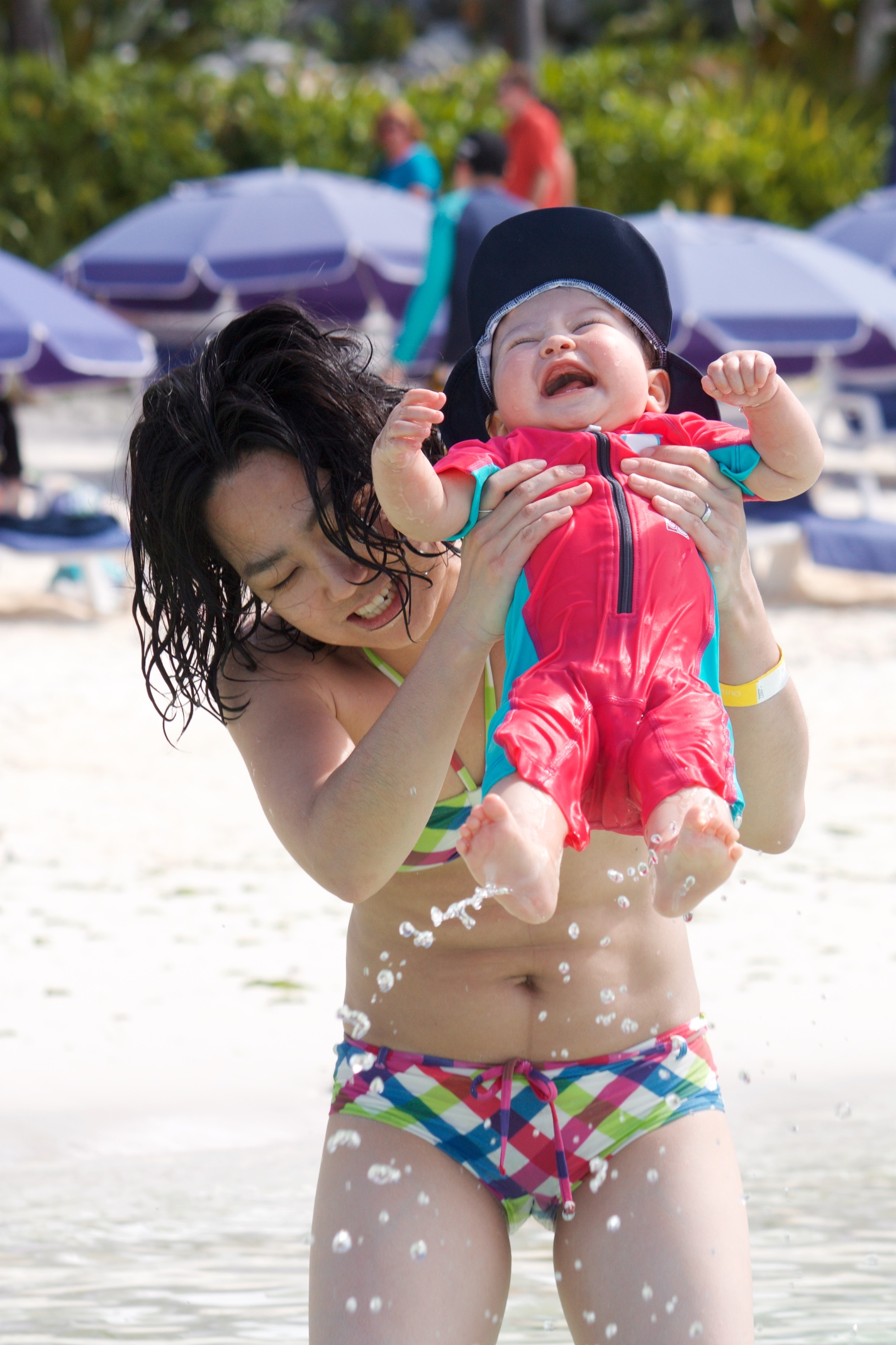 Was für ein Spaß, wenn Mama sie immer wieder in Wasser eintunkt.
