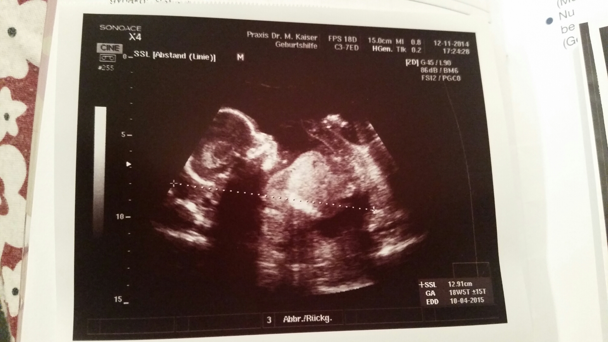 Endlich die dritte Untersuchung (19te Woche). Es ist alles in Ordnung und das Baby ist Gesund. Die Größe liegt auch voll im Durchschnitt. Vielleicht müssen wir das Kinderzimmer Rosa streichen… 🙂
