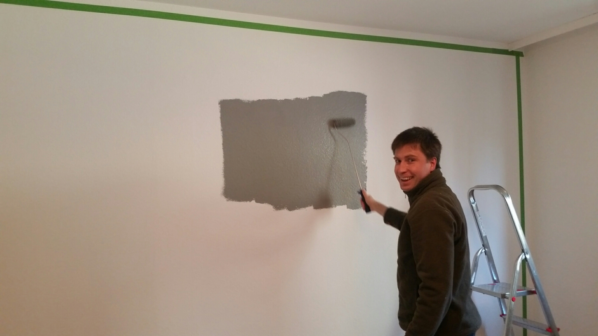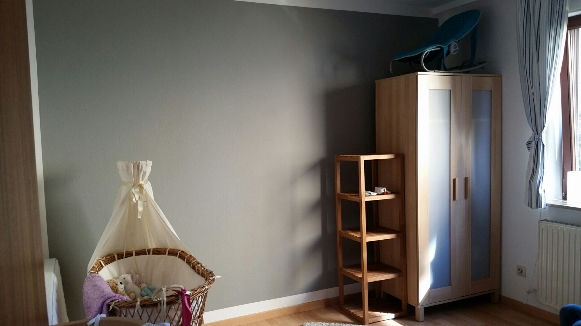 Damit sich unsere Kleine in ihrem Zimmer auch richtig wohl fühlt, haben wir in den letzten Wochen ihr Zimmer verschönert. Heute haben wir noch schnell eine Wand im hochmodernen Grau (alle Farbkarten von diesem Grau waren im Baumarkt vergriffen!) gestrichen.