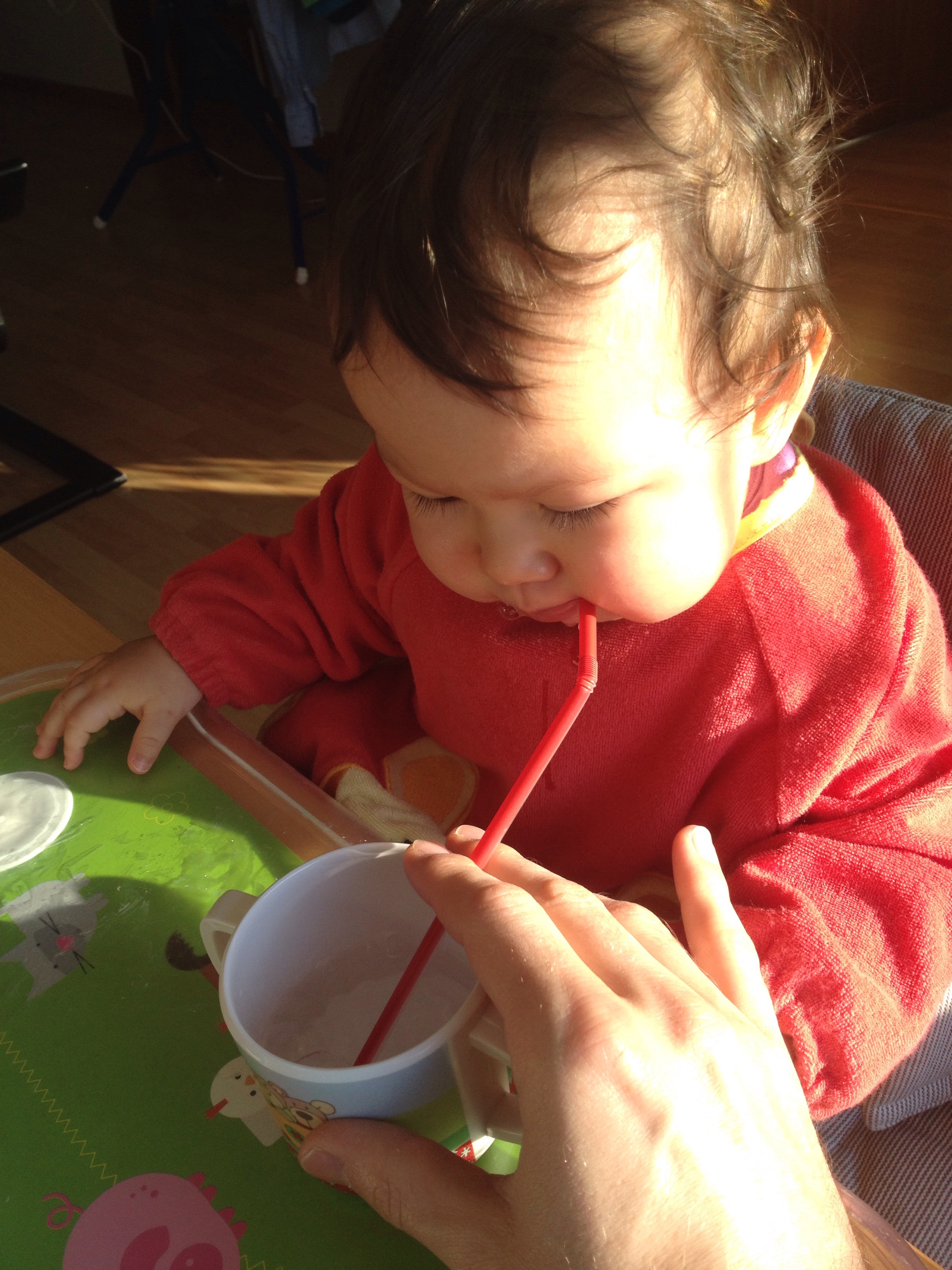 Anfang der Woche hat der Papa der Marie beigebracht, wie man mit dem Strohhalm trinkt. Mama und Papa waren begeistert und sahen traumhafte Zeiten auf sie zukommen. Es hat genau zwei Tage gedauert, dann hat Marie herausgefunden, wie man mit dem Strohhalm tolle Blubber-Blasen machen kann. Jetzt ist das Trinken oft wieder mehr Spielen als Trinken.