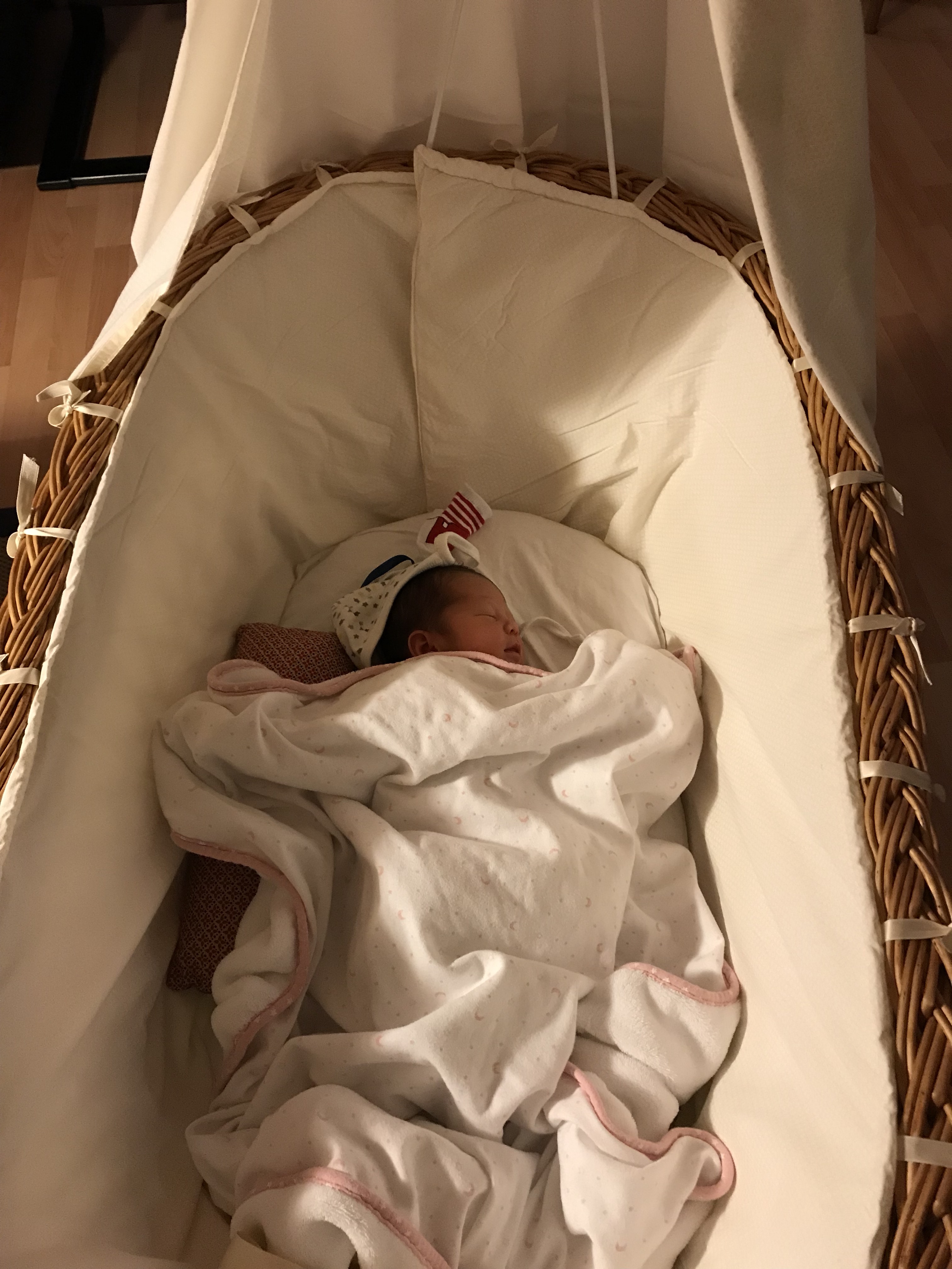 Jetzt liegt Sarah auch endlich im Familienstubenwagen. Wenn sie gerade nicht kräftig an der Brust saugt, schläft sie. Sie lässt sich auch nicht von dem Lärm der großen Schwester stören und schläft einfach weiter.